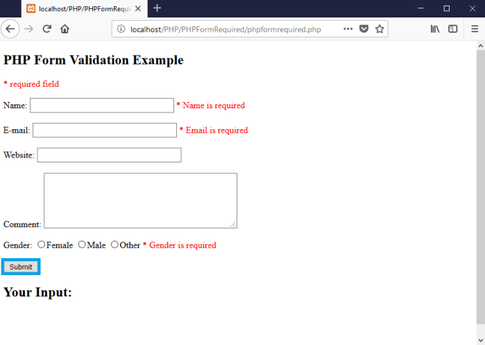 In the following code we have added some new variables: $nameErr, $emailErr, $genderErr, and $websiteErr. These error variables will hold error messages for the required fields. We have also added an if else statement for each $_POST variable. This checks if the $_POST variable is empty (with the PHP empty() function). If it is empty, an error message is stored in the different error variables, and if it is not empty, it sends the user input data through the test_input() function: