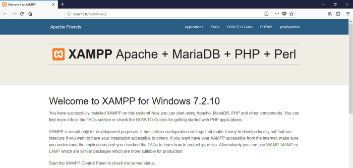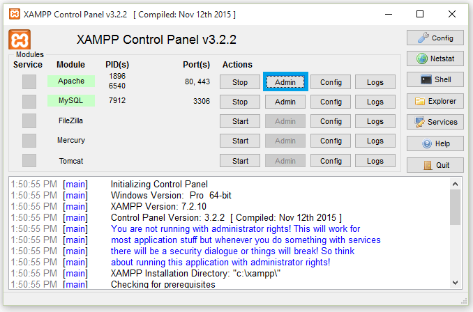 Open the XAMPP Control Panel and Start the Apache service by clicking on the Start button associated with it. Click on the Admin Button to open the dashboard on your local browser.