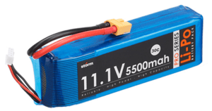 A lithium polymer battery, or more correctly lithium-ion polymer battery (abbreviated as LiPo, LIP, Li-poly, lithium-poly and others), is a rechargeable battery of lithium-ion technology using a polymer electrolyte instead of a liquid electrolyte. High conductivity semisolid (gel) polymers form this electrolyte. These batteries provide higher specific energy than other lithium battery types and are used in applications where weight is a critical feature, like tablet computers, cellular telephone handsets and radio-controlled aircraft. The battery capacity is 11.1V, 5500mAh, 35C. The dimensions are 26mm46mm153mm. The weight is 440g.